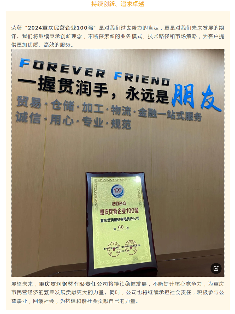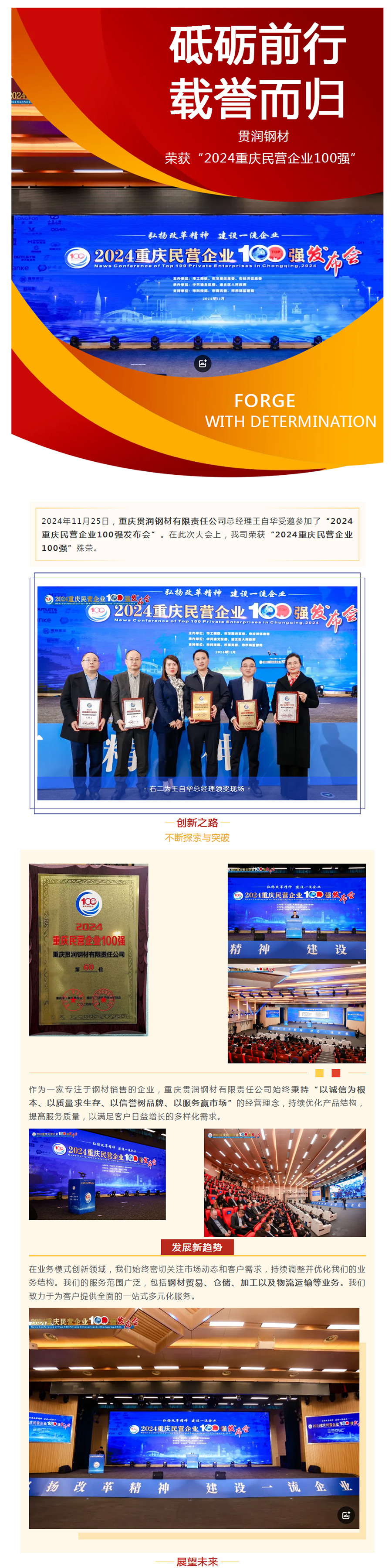 熱烈祝賀重慶貫潤(rùn)鋼材有限責(zé)任公司榮獲“2024重慶民營(yíng)企業(yè)100強(qiáng)”